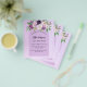A violet, lavender watercolored background and an arch frame. Decorated with violet and purple watercolored flowers and greenery. Personalise and add your name and party details.