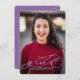 Celebrate your graduate in style with this single photo graduation announcement. It features a full-bleed photo with violet faux foil script over it. The graduate's name, year and school name are all editable.