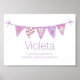 Pretty bunting flags art name poster perfect for a girl's bedroom or playroom in shades of purple, pink, creamy yellow and white. Personalize with your child's own initial on middle bunting flag, name and name meaning for a truly personalized touch to your child's bedroom or nursery, this example is for the name Violeta A graceful purple flower. Exquisite, creative and ambitious . Cute girlie poster print ideal for a new baby girl, christening or baby shower gift. Unique drawing and graphic art and design by Sarah Trett for www.mylittleeden.com