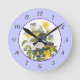 A wall clock with beautiful blooming purple, yellow and blue violets and pansy flowers from a vintage botanical painting on a light blue background with antique numbers in black.