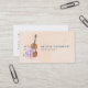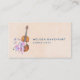 Pretty elegant professional business cards with a feminine design. Illustrated with a watercolor image of a wooden violin, some pink ballet slippers resting against it and decorated with flowers and butterflies. Set on a peach pink coloured background.