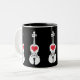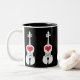 Designer Black, Red and White Violin Coffee Mug. Black Mug adorned with white violins and red hearts. Black inside. Nice gift for your violin teacher or musician friend.