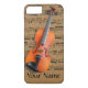 A custom phone case for the violinist or the music lover, it shows a beautiful photographic image of a violin on a light brown background with musical notes printed on it for a vintage sheet music look. A template area is included for your personalised name or text.