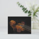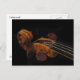 This postcard presents a classical still life of an elegant old violin scroll. This graceful instrument is essentially a hollow wooden box with rounded ends, two graceful f holes and a narrow centre. The four sets of strings extend from a string holder at the bottom of the body over a raised bridge to the end of the narrow neck, or fingerboard where the four strings are inserted into a pegbox and are held there with pegs. The pegs are used to tune the violin. When the bow is drawn across the strings on the body of the violin it produces incredible, magical music! The gorgeous golden brown, almost orange tones are set off by a black background.