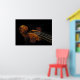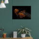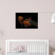 This poster presents a classical still life of an elegant old violin scroll. This graceful instrument is essentially a hollow wooden box with rounded ends, two graceful f holes and a narrow centre. The four sets of strings extend from a string holder at the bottom of the body over a raised bridge to the end of the narrow neck, or fingerboard where the four strings are inserted into a pegbox and are held there with pegs. The pegs are used to tune the violin. When the bow is drawn across the strings on the body of the violin it produces incredible, magical music! The gorgeous golden brown, almost orange tones are set off by a black background.