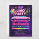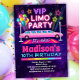 Celebrate a VIP birthday with this rainbow glow pink limo party invitation.