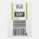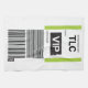 Styled as an international airline baggage-tag label with VIP status motif, plus your own choice of destination airport three-letter code, flight number, and passenger name.
