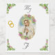 Design features a beautiful image of Our Lady of Fatima as an oval in centre. Image of delicate pink and white roses form a frame. Initials of Bride and Groom are displayed at top with the monogram of last name pictured at bottom.