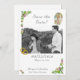 Design front features the photo you provide as main image with date displayed below in two ways. A beautiful image of Our Lady of Fatima appears at top right and is bordered by the image of delicate pink and white roses. The picture of golden wedding rings joined together is displayed at bottom left corner of photo. Customisable heading is featured in an elegant Nuptial font at top. Bordering the top left and bottom right corners are the images of roses and greenery. Names of Bride & Groom are displayed just below photo in same Nuptial font. Keeping with the traditional format for a Save the Date card, name of city and state of wedding appears at bottom.