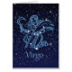 Card featuring the zodiac symbol for Virgo in soft silver blue, overlaid with the stars of the constellation, against a starry sky background graded from deep midnight blue to black.
