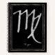 Stylised hammered silver Virgo astrology zodiac birthday symbol in a hand drawn silver fine double line frame. A hardcover or softcover notebook with your choice of inside pages. Choose from sketchbook, bullet journal, checklist, graph paper, recipe book, or lines in various widths and colours. Customisable. Aquarius text in a fine script on the front cover can be personalised, text can also be added on the back.