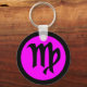 Virgo round button keychain, basic key chain style with magenta (purple hue) background, black border, original virgo symbol design. Round and square premium key chain styles and sizes are also available. Click the "customise" tab to add text, move or resize images if desired. Happy blessings from Happy Wishing Well dot com.