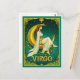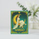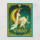 Postcard in a woman in flowing white robes, with a flower in her hair, sitting gracefully on a golden crescent moon, surrounded by stars. Ornate Art Nouveau framing with flowers, and the word “VIRGO”, complete the celestial zodiac illustration.