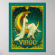 Poster in a woman in flowing white robes, with a flower in her hair, sitting gracefully on a golden crescent moon, surrounded by stars. Ornate Art Nouveau framing with flowers, and the word “VIRGO”, complete the celestial zodiac illustration.