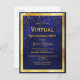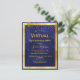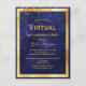 On front: A trendy, modern 50th (or any age) virtual birthday party invitation card for men. A dark blue, navy blue background. The blue colour is uneven. With a faux gold frame and golden confetti, golden coloured letters. Personalise and add a name, age and your party information.
