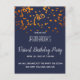 A virtual birthday party invitation with white on black type and gold confetti. Celebrate your birthday with an online social distancing party. Add your information and video chat site. Keep your spirits up by celebrating online with friends and family when you can't see them in person.