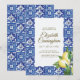 Composed of cursive script and serif typography on leafy greenery green foliage botanicals; All against a backdrop of white, yellow and blue mediterranean Spanish tiles with watercolor yellow lemons. This is a vintage celebration of life, funeral or memorial invitation.