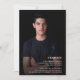 Virtual graduation party invitation for boys with your favourite photo and graduate name, school name, graduation year, and plans for the future on the front. The back of the card has information about your party on a black background.