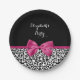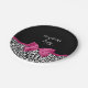 Trendy black and white leopard print paper plates with a vivacious dark pink ribbon tied into a cute girly bow. Personalise this chic and stylish animal pattern design by adding the name of your teen girl. Flat printed image, not actual ribbon.