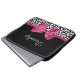 A trendy black and white leopard print 15'' neoprene laptop sleeve with a vivacious dark pink ribbon tied into a cute girly bow. Personalise this chic and stylish animal pattern design by adding the name of your teen girl. Flat printed image, not actual ribbon.
