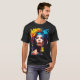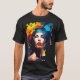 This image depicts a vibrant and expressive portrait of a woman. The artwork features bold, dynamic brushstrokes and a vivid colour palette, primarily consisting of blues, oranges, and yellows. The woman's hair appears to be in motion, with splashes of paint extending outward, creating a sense of energy and movement. Her facial expression is serene yet intense, with striking blue eyes that draw the viewer's attention. The background is minimal, allowing the focus to remain on the subject and the vivid colours that surround her.