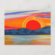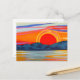 Postcard in A semi-abstract ocean sunset behind a mountain range, in vivid colours of fiery red and orange, with dark indigo blue mountains