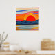 Poster in a semi-abstract ocean sunset behind a mountain range, in psychedelic colours of fiery red and orange, with dark indigo blue mountains