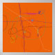 An abstract composition features colourful lines and shapes against a vivid orange background, creating a sense of movement and spontaneity. Various intersecting lines and shapes contribute to a dynamic and playful visual experience.