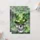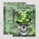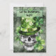 A vivid, green St. Patrick’s Day illustration featuring a skull wearing a shamrock-adorned hat with a 4-leaf clover in the mouth.