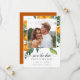 Elegant Citrus botanical save the dates feature a favourite square engagement photo encircled by a bouquet of vibrant branches of mandarin citrus and clementine, ivory blossom and leaves, "save the date" in calligraphy script lettering, with your names, wedding date and location beneath in classic grey serif type.