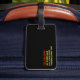 This luggage tag features an all yellow face with red and black text. The back is black with red and yellow text, and has room for four lines of contact information. The design is meant to be simple but eye catching.