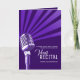 Graphic retro style chrome microphone graphics and vocal projecting lines vocal recital music performance program schedule in purple and white. Perfect for your guests to see the order of events and credit your performers that are either voice, singing or open mic, musical or at a speaking recital or musical event. Customise with your own event details including the orchestra. Ideal for a fundrasier event or and dedicated to a special person. Other matching items are available. © Unique design and illustration by Sarah Trett for www.mylittleeden.com (back photo placeholder photo by Obie Fernandez on Unsplash).