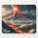A majestic volcanic eruption dominates the scene, with vibrant red lava flowing down the slopes and a plume of smoke billowing into the sky. The surrounding landscape is lush with greenery, contrasting the fiery eruption.