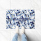 This fun volleyball themed door mat features a pattern of varied size navy, light blue and white volleyballs at varying depths overlying a net detail accent - personalise with her name - white background colour can be customised - by katz_d_zynes