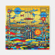 The A.I. created surreal interpretation of a futuristic surreal abstract landscape features towering structures with flying saucers and airplanes in flight navigating amongst them.