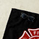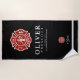 A custom Firefighter themed large black beach towel tailored to the volunteer firefighter. The Maltese Cross is representative of American Firefighters and fire rescue.