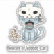 Angry looking cat with tattoo markings, bone necklace, and a skull on top of its head is sitting beside a voodoo doll with pins.
