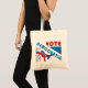 Fun and colourful, Democratic donkey kicking with red and blue stars and large text "Vote Democratic". Add your own text at top if desired. Available in various bag styles and colours. Discounts for multiple orders. By D. Bennett from Balance America.