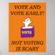 Halloween is a great time for getting the word out for upcoming elections. Use humor to make change! Put this poster up where folks will see it from now until Election Day. Message: Vote and Vote early. Not voting is scary. A ghost pops up out of a ballot box watching his arms. Orange background. Colors on card are white purple yellow and black. Let's Get out the Vote! (GOTV)
