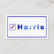 These Vote for Harris election business cards feature the presidential candidate name in blue, next to a blue square box with a red check in it. There is a lined border on that is blue. The background colour is white. The design is printed on both sides. Thank you for shopping at CherylsArt on Zazzle.
