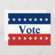 This red white and blue postcard has the word vote in the centre. A row of white stars is above the text on a blue stripe. At the bottom, there's a red stripe with white stars.