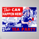 Vintage styled poster urging support for Tea Party candidates at the polls. The poster reads ' This can happen here! Vote Tea Party ' depicting a working man, paycheck in hand greeted by his family after work.