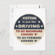 "Voting is just like driving; to go backward, choose 'R,' to go forward, choose 'D.' ..."Democrats, always the lesser of two evils!" Tees, buttons, campaign swag.