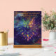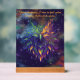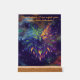 Detail: 8 x 10 inch colorful phoenix against deep purple starlit sky and colorful faded cosmo clouds painted on acrylic with wood block stand