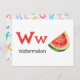 "Letter W is for Watermelon" in our Alphabet Flash Card set. Get all 26 letters of the alphabet! A double-sided postcard that is great for memory games and teaching, geared for education, schools, teachers and homeschoolers for kindergarten and babies. All text is editable if you need to customise.