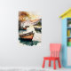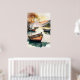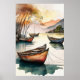 Poster of serene rowboats floating on a calm lake surrounded by mountains and trees, with a warm, golden sky illuminating the scene. The peaceful waters reflect the boats and the soft colours of the sunset.