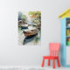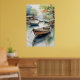 Poster of several wooden boats floating peacefully on a calm river with reflections of the surrounding trees and houses on the water. The background features lush greenery and a soft, misty ambiance, conveying a serene and tranquil setting.