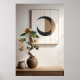 Poster of a minimalist interior scene featuring a decorative ceramic vase holding a small, elegantly styled plant with multicolored leaves, placed against a wall adorned with graphic art of crescent shapes. Soft natural light enhances the serene and modern atmosphere, highlighting the harmonious blend of art and nature.