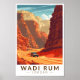Wadi Rum retro vector travel design. Also known as the Valley of the Moon, Wadi Rum is a desert landscape stretching into the horizon, the red, sandy terrain punctuated by fantastic rock formations.