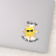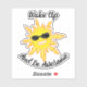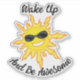 Cute fun sticker of a cool happy yellow sun wearing dark shades and a big cheeky grin. Above and below the sun are the words "Wake Up And Be Awesome" in black text. This funny happy sticker will put a smile on anyone's face.